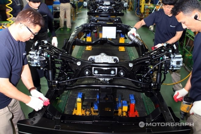 프레스 공정에서는 후드, 좌우 펜더, 좌우 사이드 아우터, 루프, 도어 등 20가지 패널을 만들어낸다. 여기서 제작된 여러 패널은 보디 공정을 통해 골격을 구성하고, 엔진룸과 언더보디, 좌우 사이드 아우터, 루프, 도어, 후드 순으로 조립이 이뤄진다. 차 1대당 조립시간은 1시간53분이 소요된다.