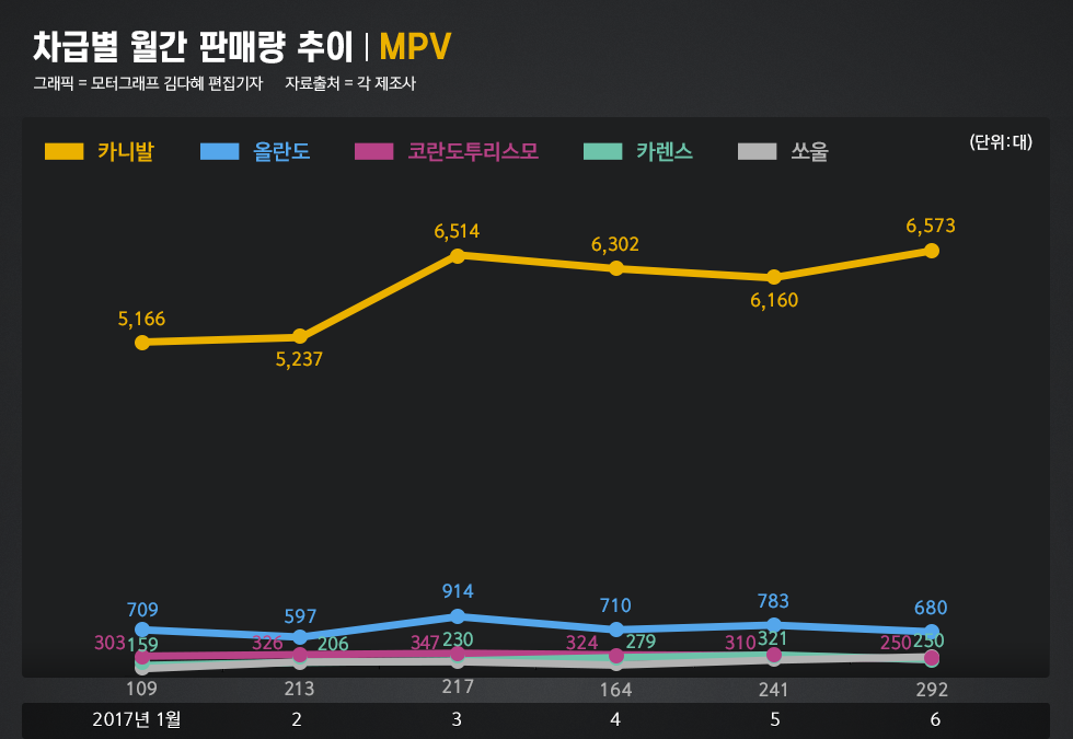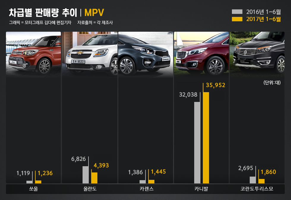 하반기는 상반기와 비슷하거나 조금 줄어들 것으로 예상된다. 압도적인 점유율을 기록하고 있는 카니발이 시장 상황에 관계없이 꾸준한 판매량을 기록하고 있다. 그러나 코란도 투리스모 및 올란도가 계속 줄어들고 있으며, 쏘울과 카렌스 등도 답이 없는 분위기다.
