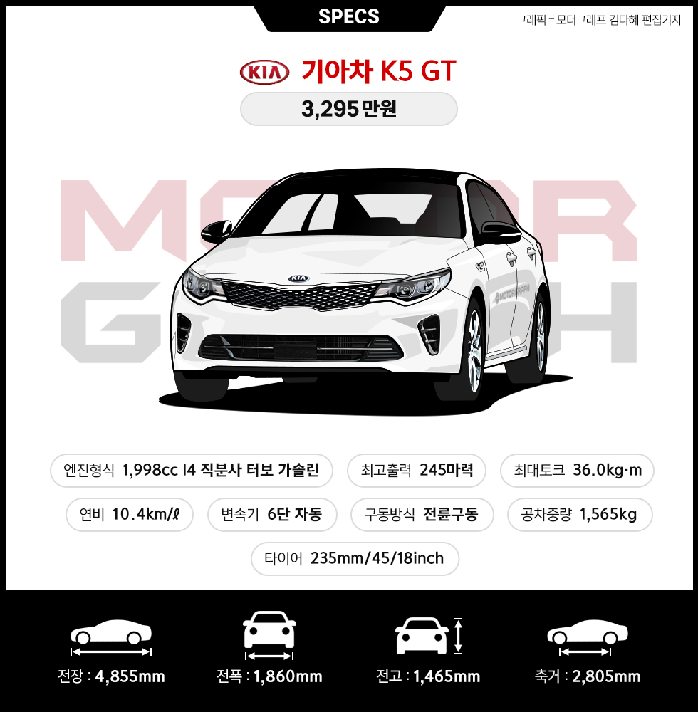 K5 GT 외관 디자인의 콘셉트는 블랙이다. 사이드 미러와 리어 스포일러 등을 블랙 컬러로 처리해 포인트를 줬다. 때때로 소소한 변화가 더 멋스럽게 다가올 때가 있다. 레드 캘리퍼를 품은 네 짝의 18인치 알로이 휠과 듀얼 머플러 팁, GT 배지는 금방이라도 달려나갈 듯한 역동성을 뽐낸다.