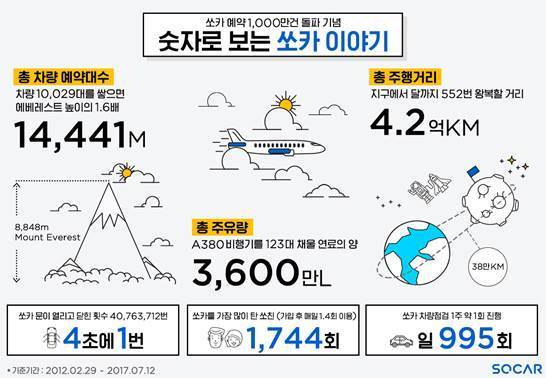 지난 2011년부터 서비스를 시작한 쏘카는 카셰어링 업계 최초로 누적 예약건수가 1000만건을 돌파했다고 26일 밝혔다.