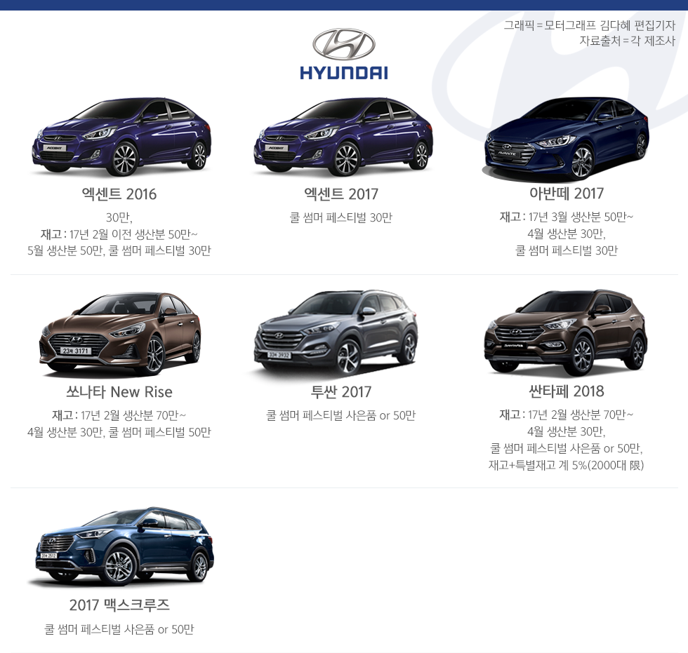 현대차 판매 조건은 지난달에 이어 이번 달도 싼타페가 핵심이다. 이달 싼타페 구입시 2000대 재고 물량에 한해 5% 할인이 우선 지원된다. 이후 물량의 경우 최대 70만원 할인을 적용한다.