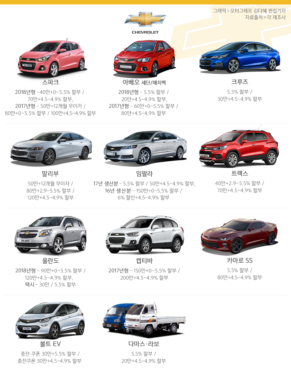 스파크와 말리부의 경우 8월 구매시 50만원 할인과 12개월 무이자 할부를 동시에 누릴 수 있다. 현금 할인은 차종에 따라 최대 250만원(2000cc 미만 차량 보유 및 자사 차량 재구매 등)까지 제공되며, 최장 60개월 할부를 지원받을 수 있다.