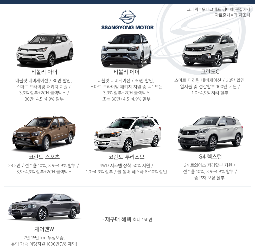 이외 코란도 투리스모 일부 모델에 한해 최대 10% 특별 할인을 제공하며, 차종별로 재구매 대수에 따라 최대 150만원(G4렉스턴, 4대 이상)의 할인 혜택이 지원된다.
