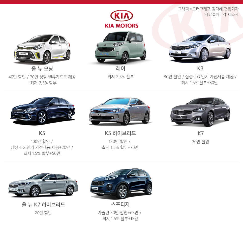 기아차는 8월 경차 라인업과 K시리즈에 고른 판매 혜택을 제공하고 나섰다. 특히 K3와 K5의 경우 최대 100만원 현금 할인 또는 삼성 및 LG 인기 가전제품을 구매 조건으로 내걸었다.