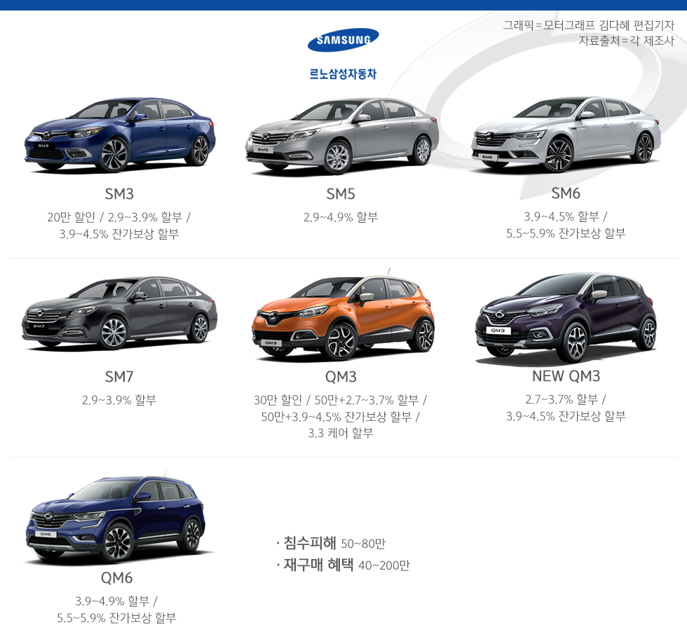 르노삼성은 이달 장마철 침수 피해를 입은 고객에게 최대 80만원 할인을 지원한다. 이어 재구매 고객에게는 최대 200만원의 더블 할인 혜택을 제공한다.