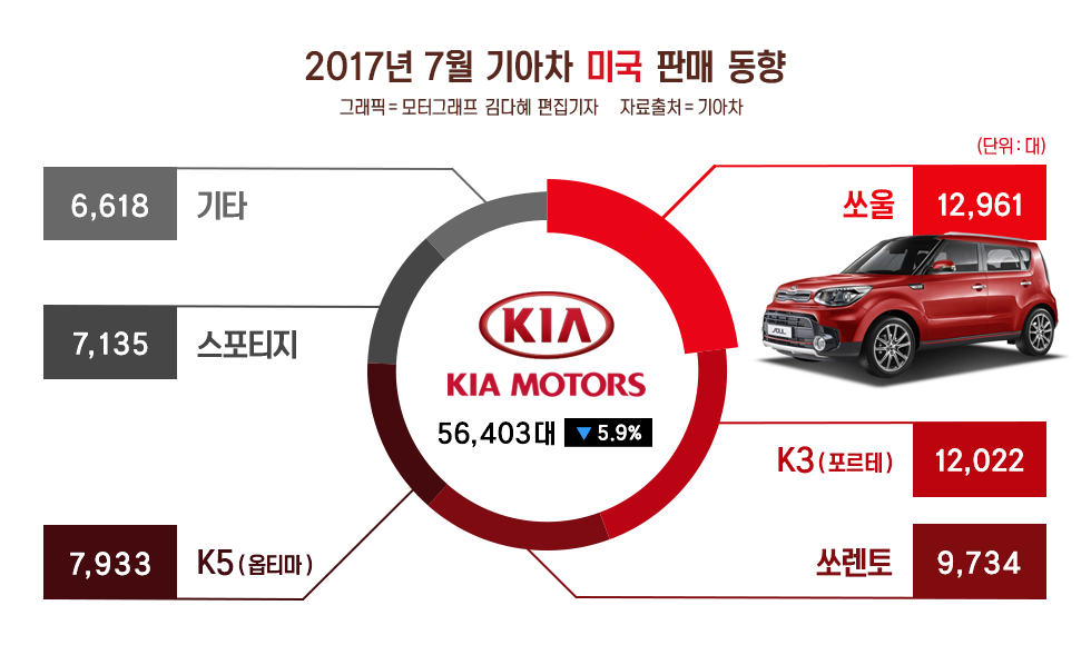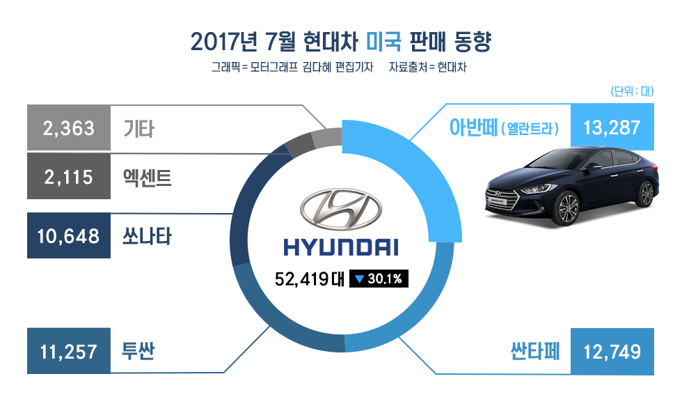 현대차의 경우 주력인 쏘나타와 아반떼(현지명: 엘란트라)가 발목을 잡았다. 쏘나타 판매량은 사실상 반토막(-48.4%)이 났고, 아반떼 역시 전년대비 35.6%나 급감했다. 이어 엑센트도 작년 7월보다 70%에 달하는 하락세를 보였다.