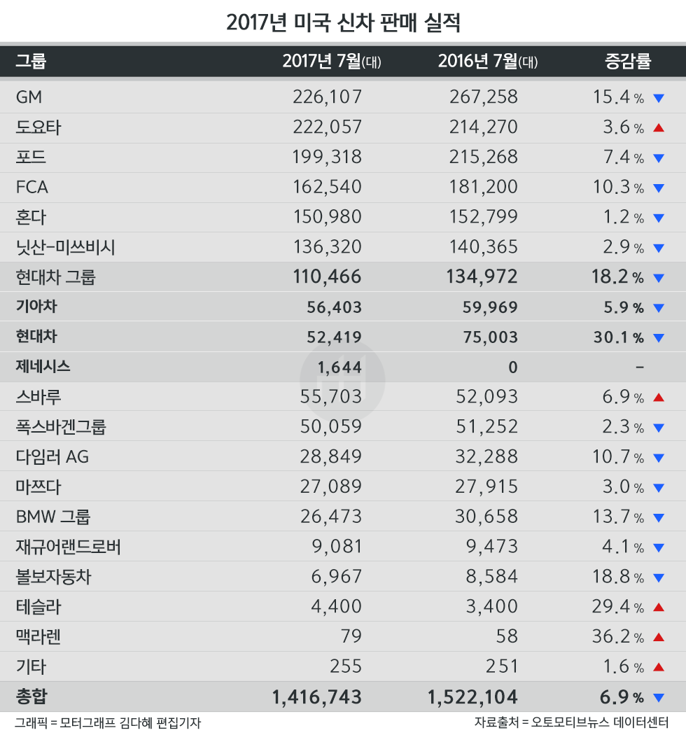 현대차그룹은 지난 7월 미국 시장에서 전년대비 18.2% 감소한 11만466대를 판매했다. 이는 시장 평균성장률(-6.9%)보다 11.3%포인트(p)나 더 낮을 뿐 아니라, 전체 제조사 가운데서도 가장 부진한 성적이다.