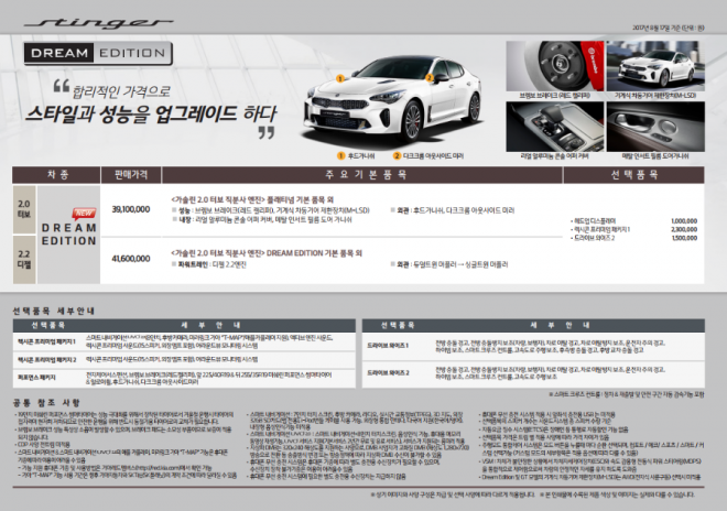 스팅어 드림 에디션의 가격은 2.0 터보 3910만원, 2.2 디젤 4160만원이다.