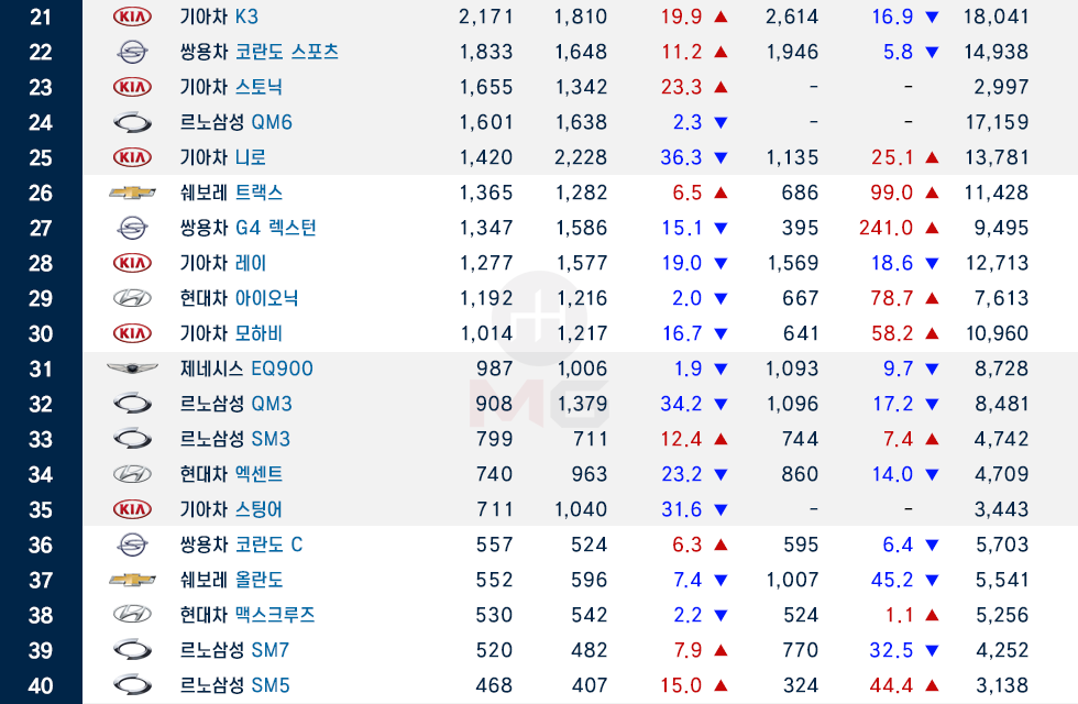 크루즈(429대)는 올해 출시된 신차임에도 불구하고, 판촉 프로모션이 줄어들자 판매가 반토막났다. 과거 베스트셀링 탑10의 단골이던 스파크(4034대)도 순위에서 밀려났다. 스파크는 지난달 무이자 할부와 현금 할인 등을 동시에 제공했지만, 실적이 제자리 수준에 머물렀다.