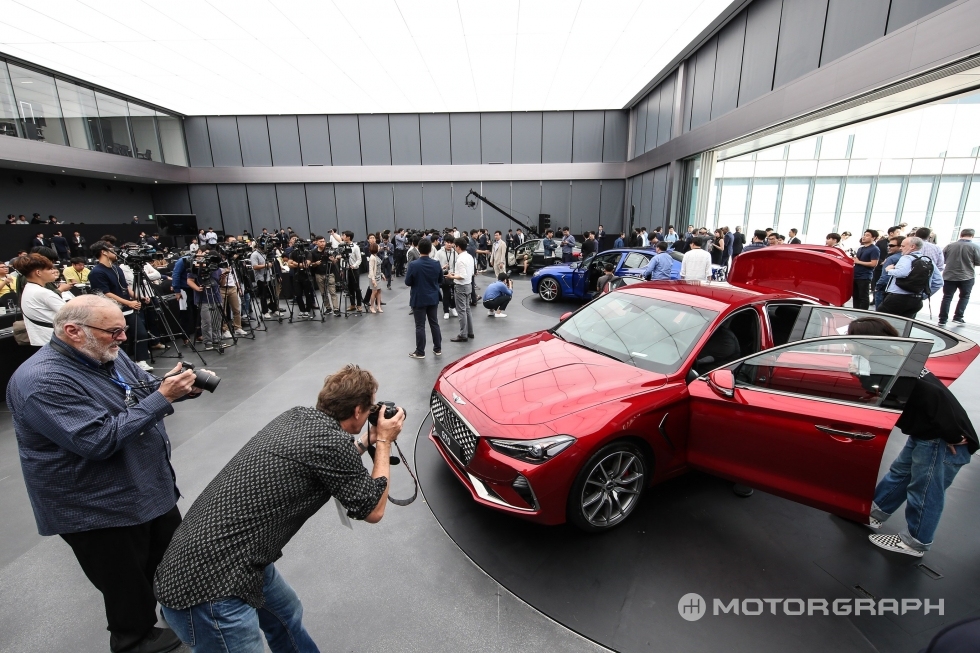 행사가 조금 늦어진 탓인지 -가장 중요한- 질의응답은 생략됐고, 곧바로 여러 트림의 G70이 모습을 드러냈습니다. 현대차가 초청한 외신 기자들도 많았고, 아주 열정적으로 차를 살폈습니다. 그들의 틈새에 껴서 대화를 엿듣는데, 역시나 ‘엘란트라’란 단어가 종종 등장했습니다. 우리가 ‘제네반떼’라고 부르는 것과 비슷한 이치였죠. 사람들의 눈은 크게 다르지 않나 봅니다.