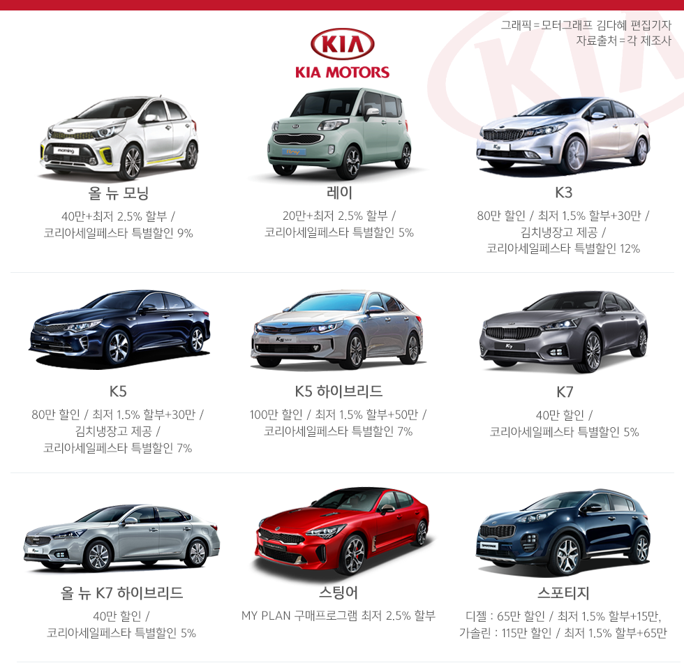이외 신형 모닝은 최대 9% 할인 조건이 제시됐다. 반면, 인기 차종인 쏘렌토와 카니발 등은 이달에도 별다른 구매 혜택이 없다.