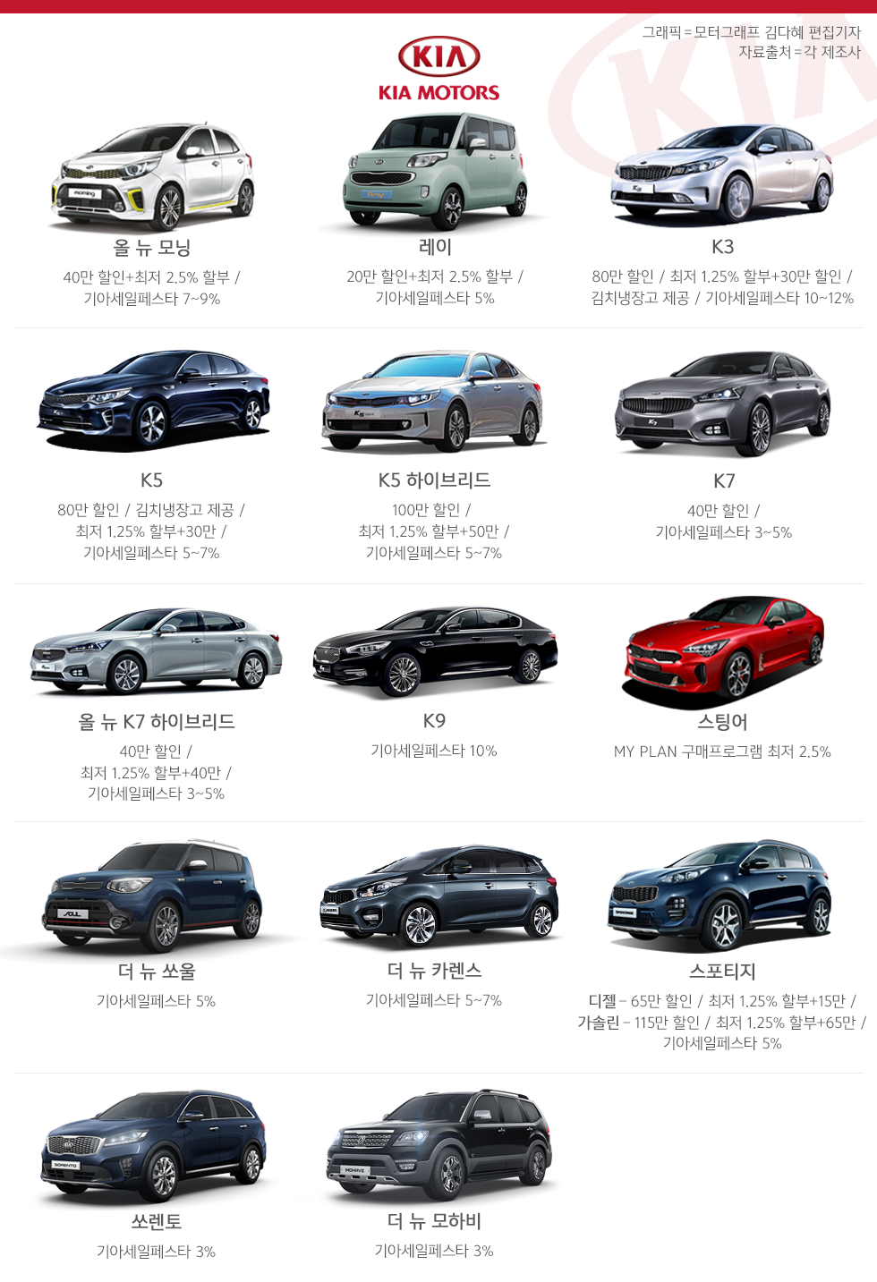 이와 함께 기아 타이거즈 한국시리즈 우승을 기념해 일부모델 선착순 특별판매도 실시한다. 경차는 최대 9%, K시리즈는 최대 12% 할인이 적용된다.