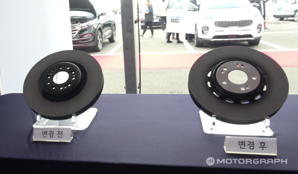 하지만 얼핏보기엔 기존 브레이크 시스템과 유사하고, 경쟁사 제품들에 비해 화려하지 않지만 무게는 20% 가량 감량한 제품이라고 현대차 관계자는 설명했다. 자세히 보니 중앙부 반짝이는 알루미늄 합금부나 빙 돌아가며 구멍을 뚫어 놓는 등 냉각 성능을 향상시키기 위한 노력도 눈에 띄었다.