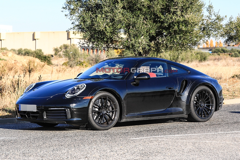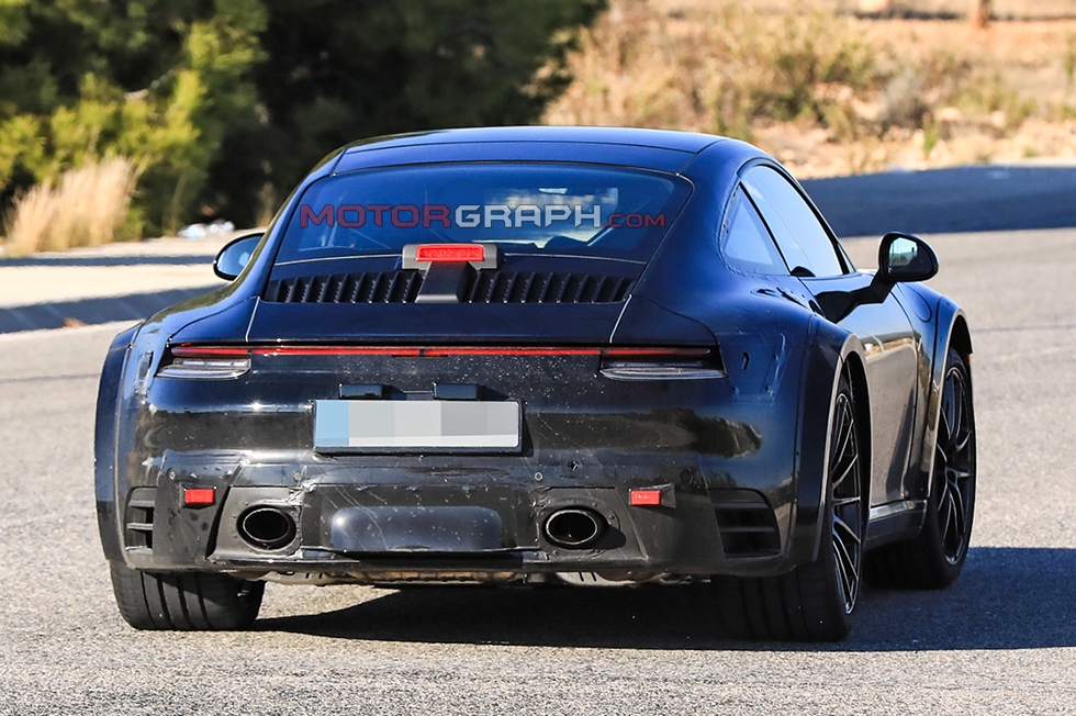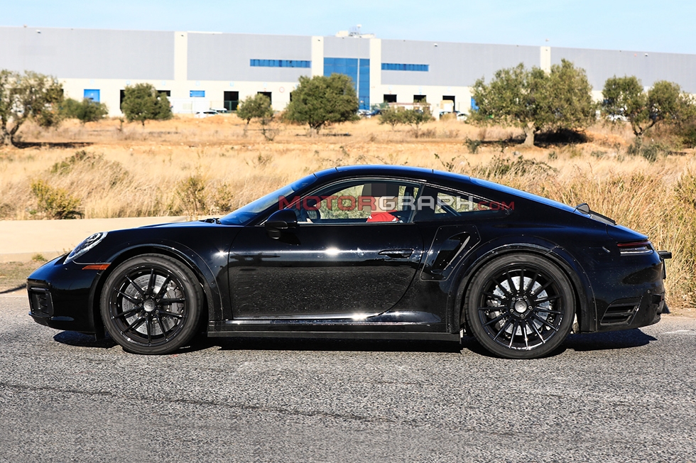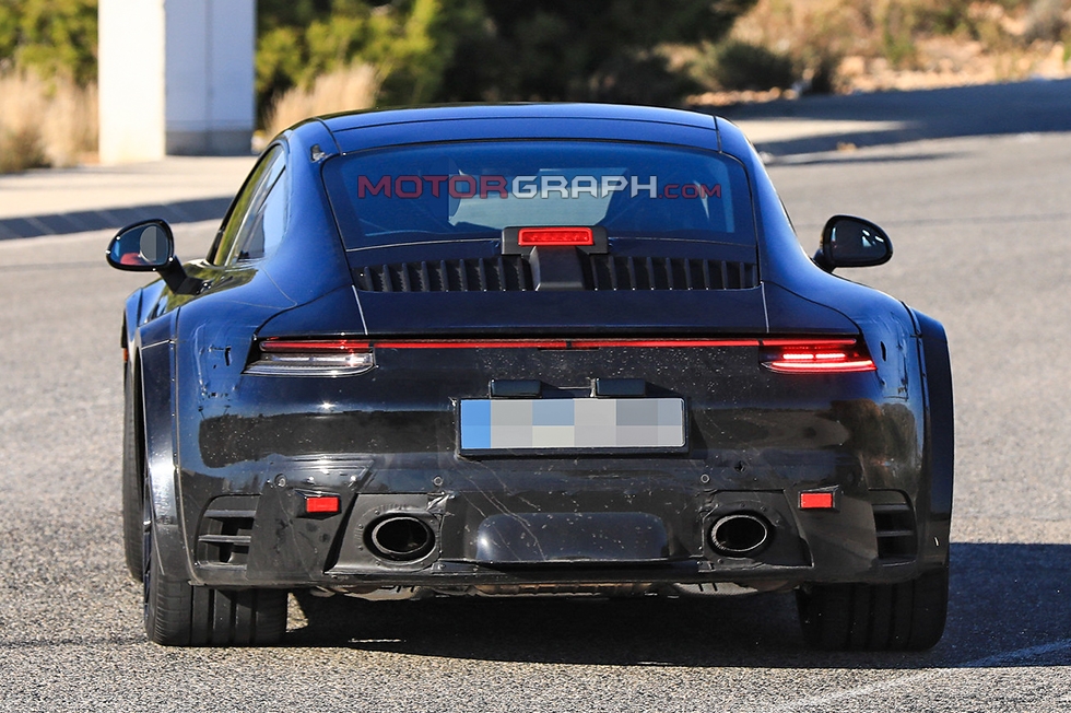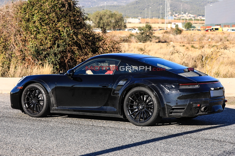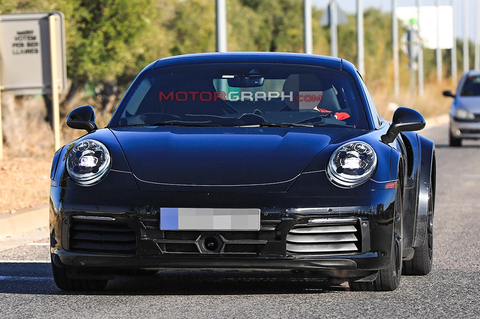 포르쉐 신형 911 터보 시험주행차가 이달 23일(유럽 현지시간) 독일 한 도로에서 포착됐다. 좌우 리어 펜더에 각각 하나씩 자리 잡은 에어벤트가 신차의 성격을 암시한다.