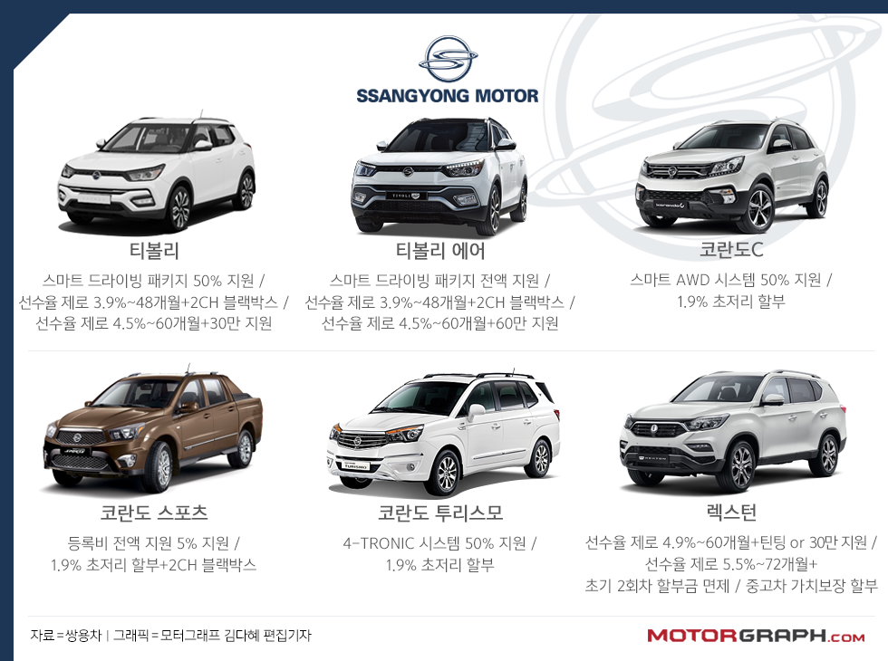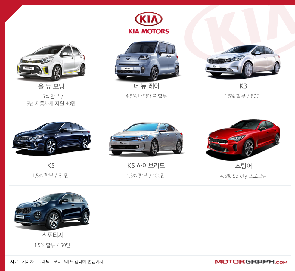 모닝과 K3, K5(하이브리드 포함), 스포티지 구매 고객들은 1.5% 저금리(최대 36개월) 할부 구매 프로그램 또는 50만원 현금 할인(모닝 40만원) 등을 선택할 수 있다.