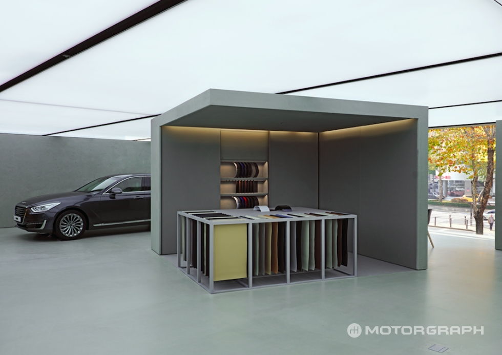 제네시스 전용 향·사운드를 통해 방문객들이 제네시스의 가치를 몸으로 느끼면서 전시 차량에만 온전하게 집중할 수 있게 했다. 또, 실제 차량 전시뿐 아니라 제네시스 라인업의 모든 외장 컬러칩과 우드 및 가죽 내장재 실물을 직접 조합해볼 수 있도록 차체와 가죽 시편을 한쪽 벽면에 전시했다.