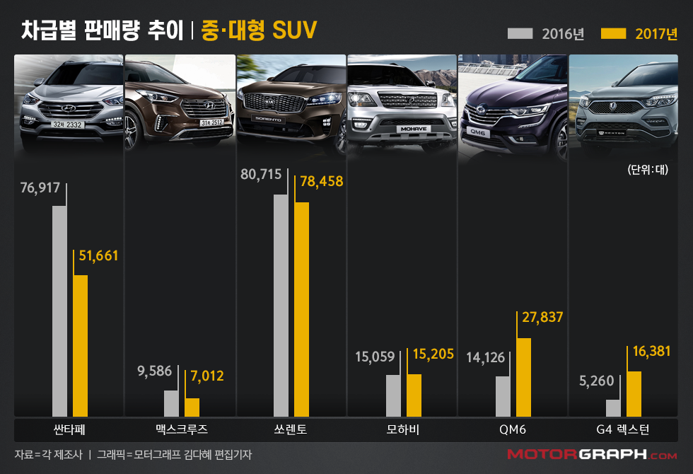 모터그래프 조사에 따르면 작년 국산 중·대형 SUV 판매량은 20만6457대로, 전년(21만3423대) 대비 3.3% 감소했다.