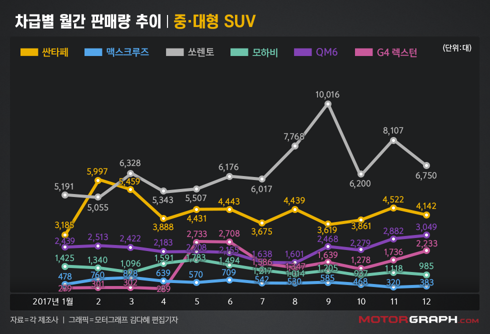 싼타페가 풀체인지를 앞두고 주춤한 가운데, 쏘렌토가 페이스리프트 효과를 앞세워 중형 SUV 시장에서 강력한 존재감을 발휘했다. 대형 SUV 시장에 새롭게 진출한 G4렉스턴은 당초 목표했던 실적에는 미치지 못했으나, 나름 안정적인 실적을 유지하며 신차 효과를 뽐냈다.