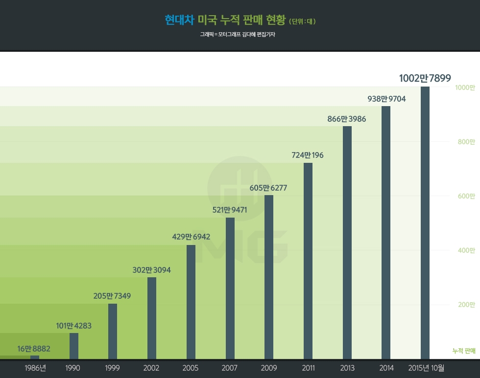 이는 현대차가 1985년 4월 미국 현지 법인(HMA)을 설립한지 33년 만이다. 현대차는 이듬해인 1986년 엑셀 수출을 시작하며 본격적인 현지 판매에 돌입했으며, 기아차는 1994년부터 현지 판매를 시작했다. 참고로 현대차는 2015년 10월 미국 판매 1000만대를 돌파한바 있다.