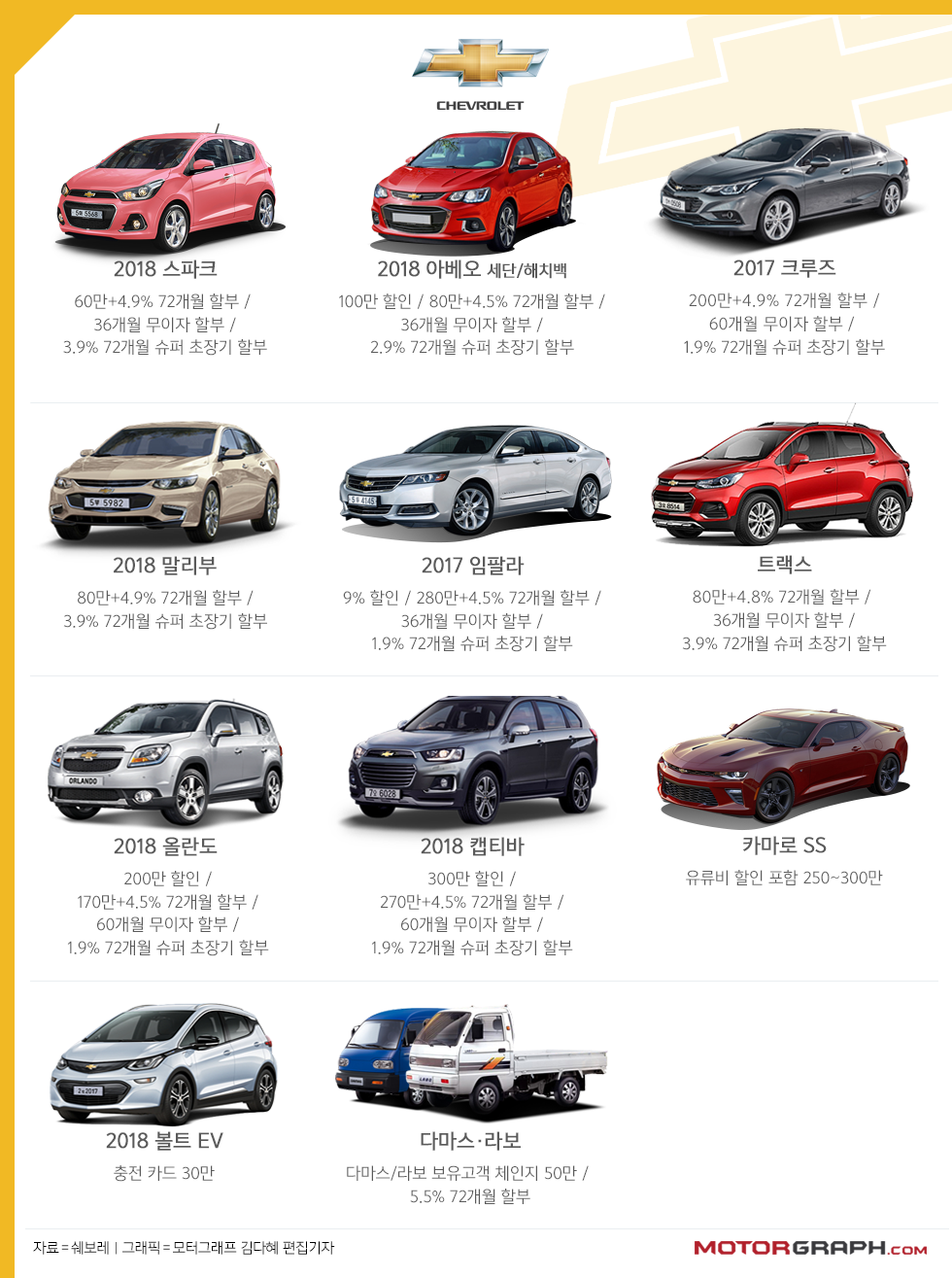 할인은 카마로 SS와 캡티바가 300만원, 임팔라가 최대 9%이다. 스파크, 말리부, 트랙스 구입 고객 중 신입생·졸업생·입사·퇴직·결혼·신규사업자·출산·임신 등에 해당할 경우 30만원 특별 할인이 주어진다.