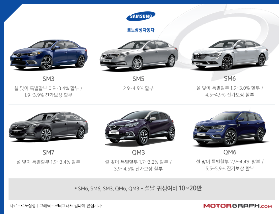 설 맞이 특별 할부(36개월 기준)를 선택할 경우, SM6와 SM7은 1.9% 금리가 적용되며, SM3는 0.9% 금리로 차량 구매가 가능하다. QM3와 QM6는 각각 1.7%, 2.9% 금리 혜택을 받을 수 있다.