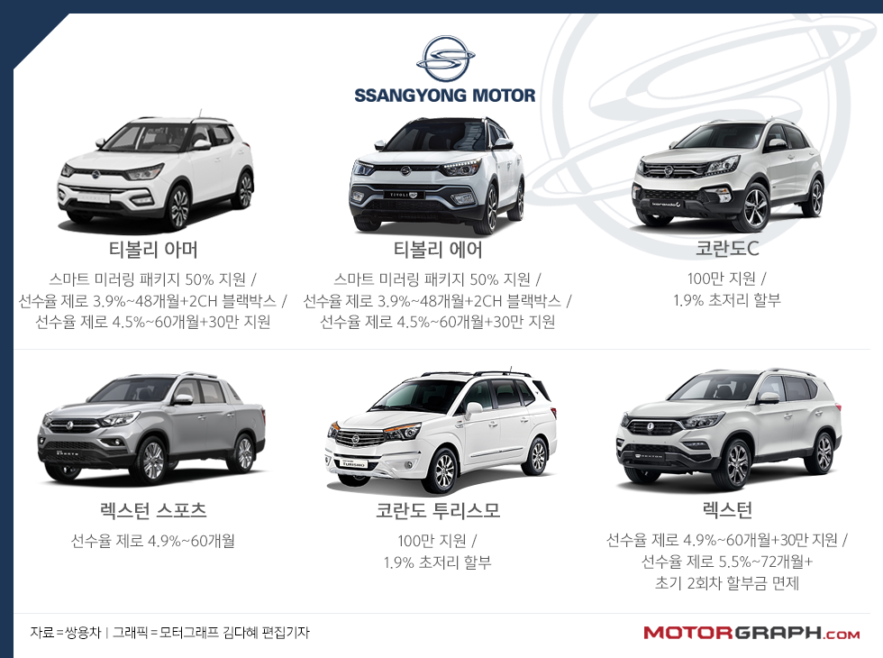 G4렉스턴과 코란도C, 코란도 투리스모는 이달 뉴 프로미스 531 프로그램을 무상 제공한다. 해당 프로그램은 5년/10만km 무상보증, 3년 3회 무상점검, 1년 1회 소모품(엔진오일) 교환 서비스 등이 포함됐다. 여기에 코란도C와 코란도 투리스모는 출고 1개월 이내 품질 불만족시 신차교환 서비스가 추가된다.