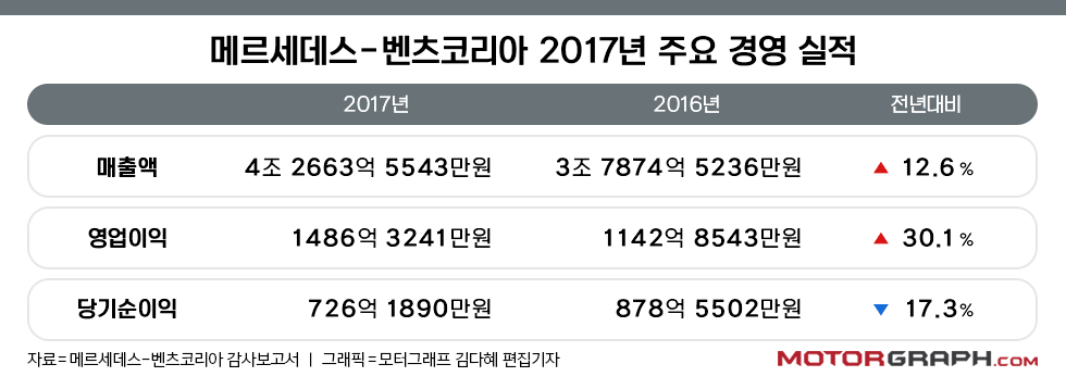 메르세데스-벤츠코리아가 수입사 최초로 연 매출 4조원을 돌파했다. 지난해 영업이익은 30% 성장세를 보인 반면, 순이익은 두 자릿수 감소세를 기록했다.