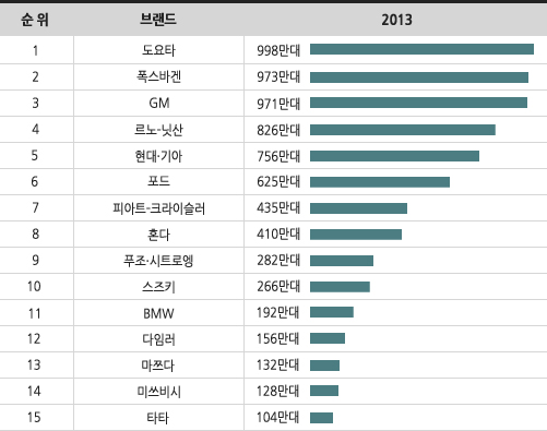 프랑스 자동차 전문지 라구스(L’Argus)는 18일, 세계 자동차 업체 20곳의 2013년도 판매량을 조사해 발표했다.
