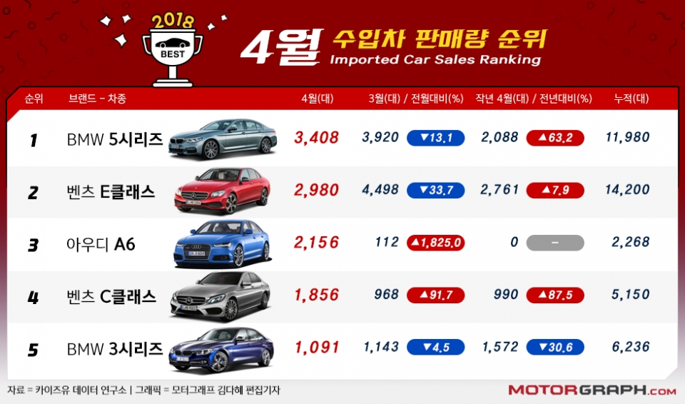 카이즈유 데이터 연구소에 따르면, 지난달 메르세데스-벤츠는 전년대비 27.5% 증가한 7355대를 판매했다. 지난 3월에 이어 두 달 연속 월 7000대 이상을 기록했다. 이는 르노삼성(6903대), 한국GM(5378대) 등 국산차 판매보다 높다. 메르세데스-벤츠는 E클래스(2980대)를 필두로, C클래스(1856대), S클래스(690대) 등이 베스트셀링 탑10에 포진했다. E클래스 판매량은 전달(3월 4498대)보다 1518대나 줄었지만, C클래스(1856대)와 A클래스(291대)가 실적을 만회했다.