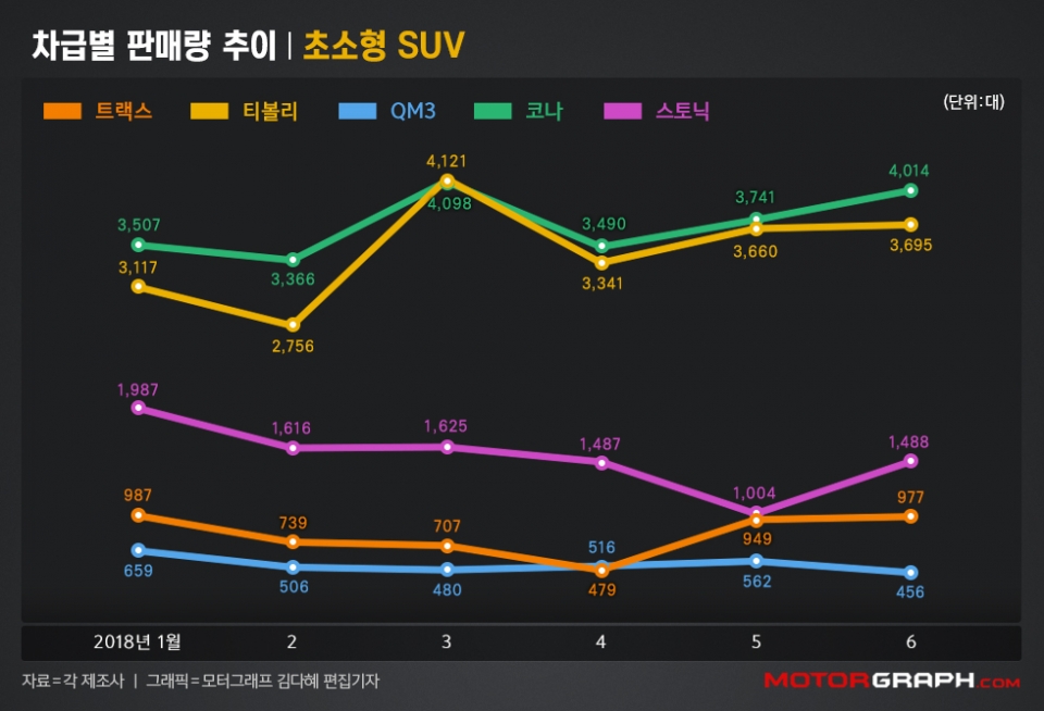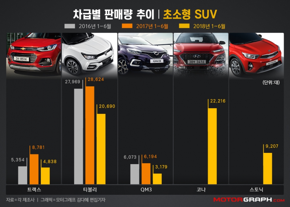 모터그래프 조사에 따르면 상반기 국내 초소형 SUV 판매량은 6만130대로, 전년(4만3599대) 대비 37.9% 증가했다. 티볼리와 트랙스, QM3 등이 노후화 되며 줄었으나, 코나와 스토닉이 3만대 이상을 더해준 덕분에 큰 폭의 성장세를 기록할 수 있었다.