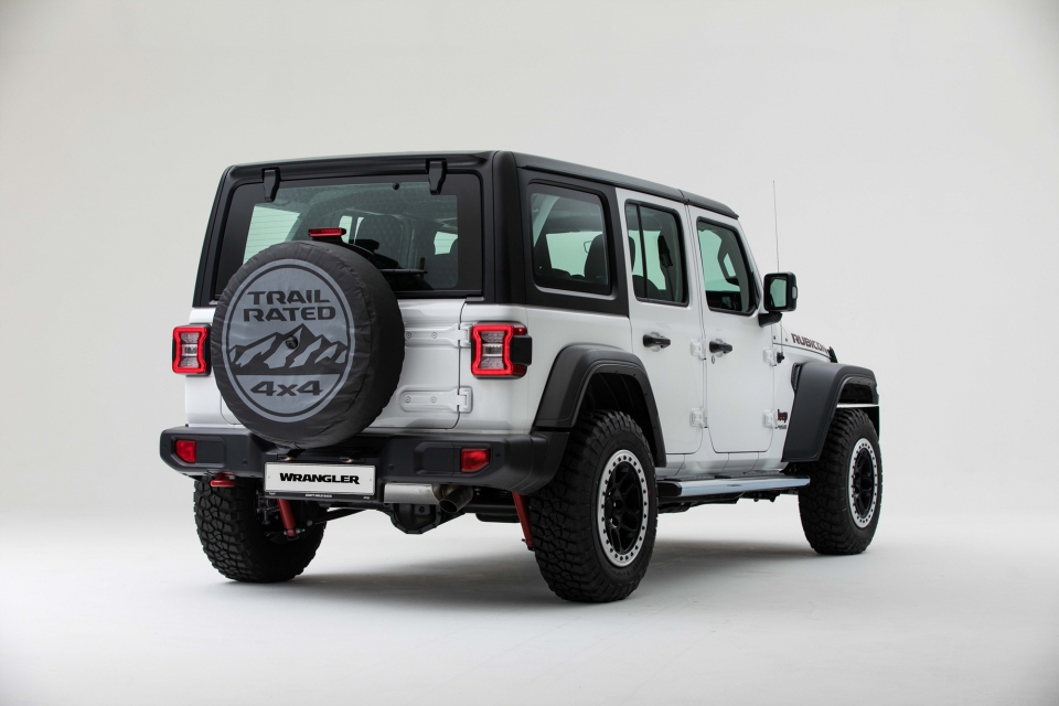 이번 런치 에디션은 2.0 루비콘 4도어를 기반으로 제작됐고, 스테인리스 스틸 재질의 도어 실 가드(Door Sill Guard)와 튜블라 크롬으로 장식된 사이드 스텝(Side Steps)이 적용됐다. 볼록한 돔으로 입체감을 표현한 17인치 비드 락(Bead-lock) 알루미늄 휠과 실버 바탕에 블랙으로 지프의 아이덴티티가 녹아있는 타이어 밸브 스템 캡(Valve Stem Cap)이 적용됐다. 이 외에도 후면의 스페어 타이어 커버에는 트레일 레이티드(Trail Rated®) 뱃지가 붙었다.