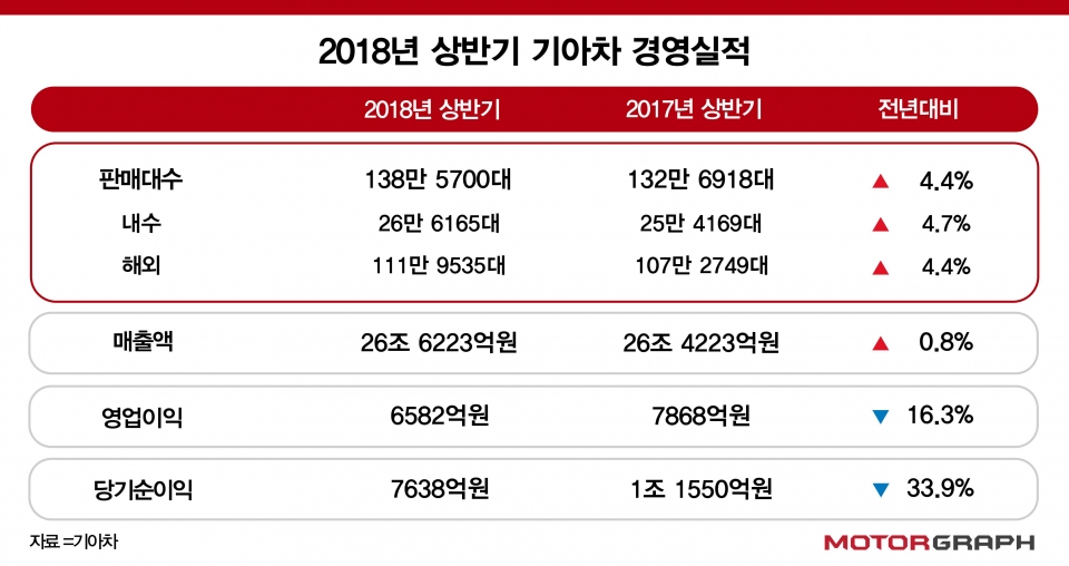 기아차 관계자는 “판매 확대와 판매단가 상승으로 매출액이 증가했음에도 불구하고 원화 강세와 재고 축소를 위한 인센티브 증가 등의 영향으로 영업이익은 하락했다”며, “올해 남은 기간 스포티지 상품성개선, 니로 EV, 신형 쏘울 등 경쟁력 있는 신차를 선보이고 RV 판매 비중을 지속 확대해 나가는 등 수익성 방어에 최선을 다할 계획”이라고 밝혔다.