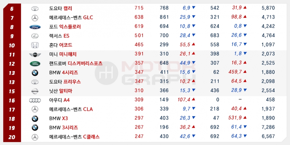 다음으로는 도요타 캠리가 715대로 일본 중형 세단 경쟁 모델들을 앞섰고, 메르세데스-벤츠 GLC와 포드 익스플로러는 각각 638대, 619로 베스트셀링 SUV의 위엄을 보였다. 또, 렉서스 ES는 풀체인지를 앞두고 있음에도 501대가 팔렸으며, 풀체인지된 혼다 어코드도 465대로 10위권에 이름을 올렸다.