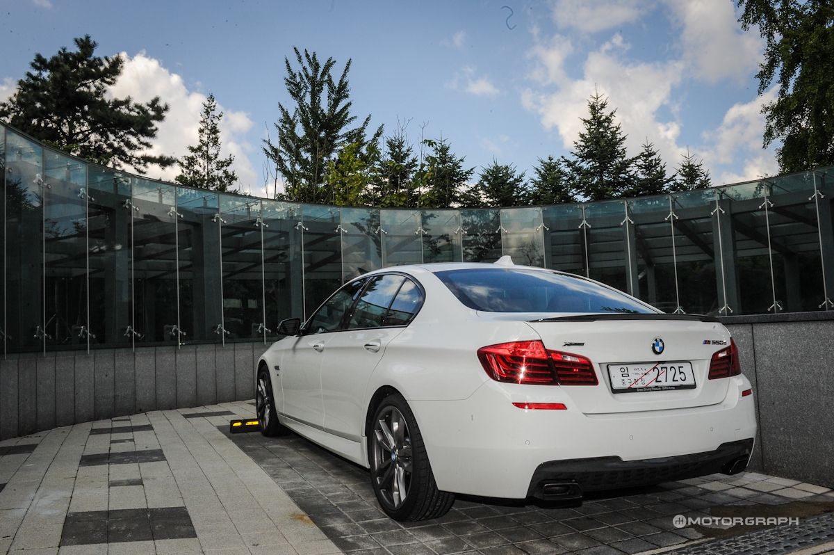 BMW M550d xDrive의 첫느낌이 그리 놀랍지는 않았다. 스포츠세단이라기는 차체가 너무 큰 느낌이고, 서스펜션도 부드러웠다. M5에 비해 전혀 부족할 것이 없다는 해외 자동차 전문매체의 평가와 535d에서 느꼈던 폭발력 그 이상을 기대했기 때문에 처음엔 다소 밋밋하다는 느낌이었다. 차량 통행이 많은 월요일 아침 출근길이라 이 차를 마치 520d처럼 운전한 탓이 가장 클 것이다.