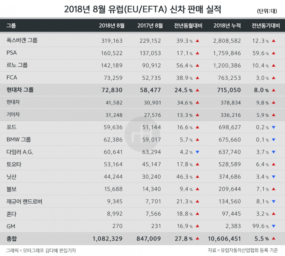 유럽자동차산업협회(ACEA)가 19일(현지시각) 발표한 자료(등록 기준)에 따르면, 현대차그룹은 지난 8월 한 달간 유럽(EU 및 EFTA) 시장에서 전년대비 24.5% 증가한 7만2830대를 판매했다.