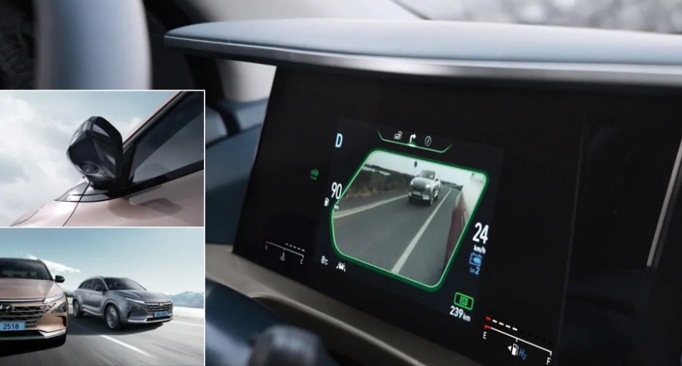 넥쏘의 경우 왼쪽 방향지시등을 켜면 왼쪽 사이드미러 모양이 뜨고, 오른쪽 방향지시등을 켜면 오른쪽 사이드미러 모양이 뜹니다. K9의 경우 왼쪽 방향지시등을 켜면 계기판 왼쪽 속도계에 영상이 나오고, 오른쪽 방향지시등을 켜면 오른쪽 회전계에 영상이 나옵니다.