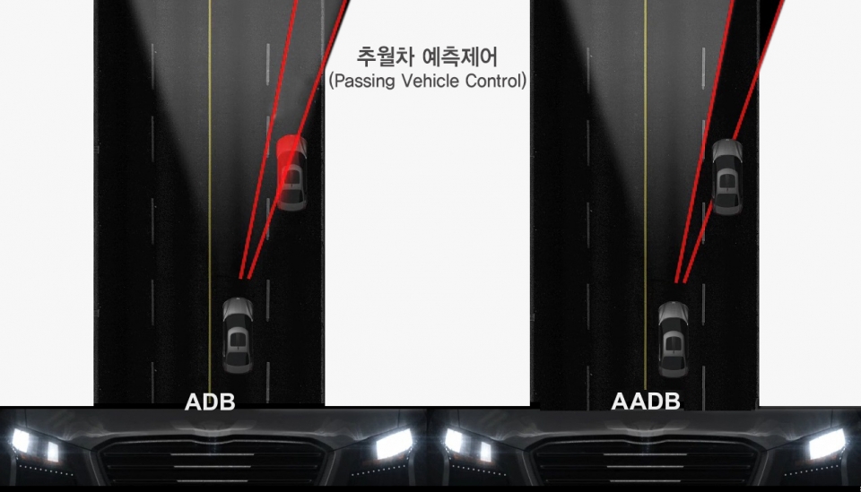 현재 프리미엄 브랜드 중 일부 차종에만 적용된 지능형 헤드램프(ADB)는 상시 상향등 상태로 운전자 시야를 확보하는 동시에, 마주오는 전방 차량 부분만 빛을 차단해 앞차 운전자의 눈부심을 막는다. 다만, 기존 제품의 경우 뒤에서 추월하는 차량이나 빠르게 커브길을 선회하는 차량 등 주변 차량의 급격한 움직임에 제대로 대응하지 못하는 한계가 지적된다.