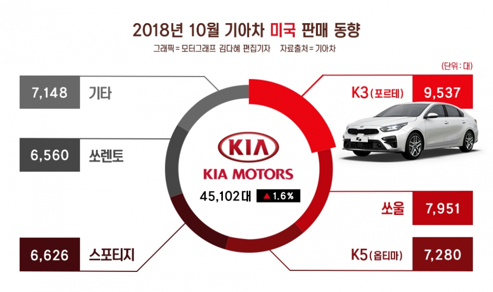 기아차 역시 풀 체인지 모델이 투입된 K3(포르테)가 9537대를 기록하며, 브랜드 실적을 주도했다. 지난 9월 K3 판매량은 6470대에 불과했다.