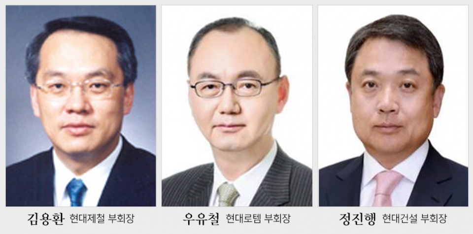 먼저, 부회장단에는 현대차 김용환 부회장이 현대제철 부회장으로, 현대제철 우유철 부회장이 현대로템 부회장으로 각각 이동했다. 현대차 전략기획담당 정진행 사장은 현대건설 부회장으로 승진했다.