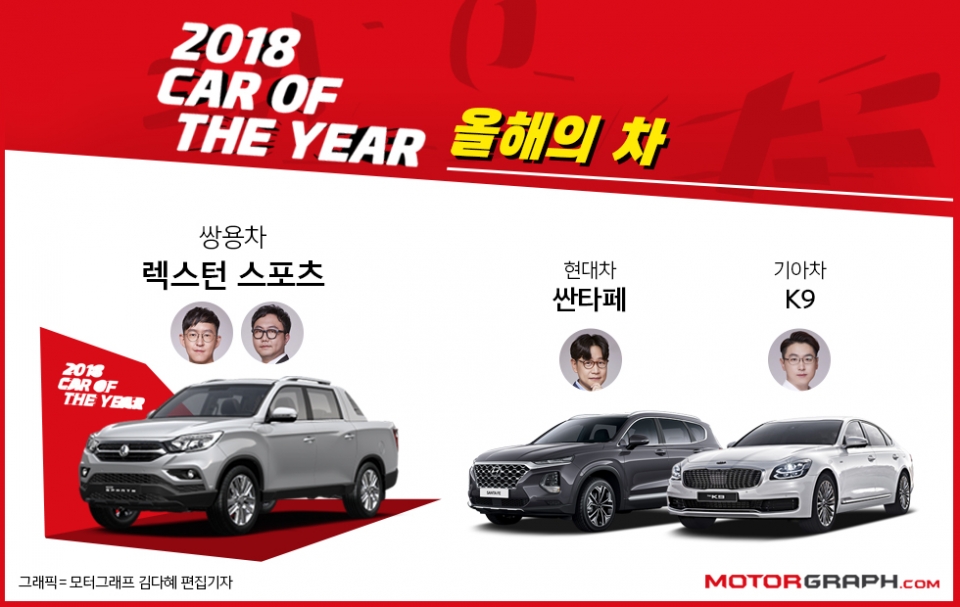 기자들이 선정한 올해의 차에는 기아차 K9, 쌍용차 렉스턴 스포츠, 현대차 싼타페 등이 최종 후보에 올랐다. 전작의 실패를 딛고 브랜드 플래그십 세단의 자존심을 회복한 K9, 틈새 시장을 넘어 회사의 새로운 주력 모델로 성장한 렉스턴 스포츠, 그리고 국내 SUV 시장의 현재를 이끄는 싼타페가 격돌했다.