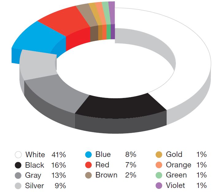 리포트에 따르면, 전 세계적으로 화이트·블랙·그레이·실버 등 무채색 계열 비중이 80%에 달했다. 특히, 화이트는 아시아·태평양 지역에서 53% 점유율로 높은 인기를 보였고, 북미와 유럽에서도 각각 25%, 33.3%의 점유율을 기록했다. 무채색 계열에서는 실버 색상의 선호도가 예년보다 감소했다.