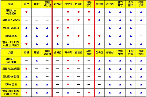 | ▲ 현대차가 진행한 '수입차 비교시승 이벤트' 1차(위)·2차(아래) 결과. 주행 성능 부문에서는 대부분 낮은 평가를 받았다 | ||