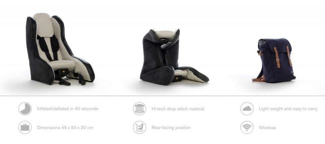 볼보가 14일(현지시간) 공개한 ‘차일드 시트(Child Seat)’ 콘셉트는 마치 튜브처럼 공기가 주입돼 있다. 에어 펌프가 시트에 장착돼 40초만에 자동으로 시트를 부풀리거나 공기를 뺄 수 있다. 공기를 전부 빼면 배낭에 들어갈 정도로 부피가 줄어든다. 크기는 가로 45mm, 세로 50mm, 폭 20mm에 불과하다. 또 무게는 5kg을 넘지 않아 휴대하기도 간편하다.