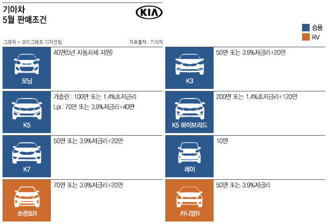 기아차는 5월 한 달 동안 모닝 구입 고객에게 5년치 자동차세에 해당하는 40만원을 지원한다. 또, K3 구매 시 50만원(또는 3.9% 할부+20만원)을 할인해준다.