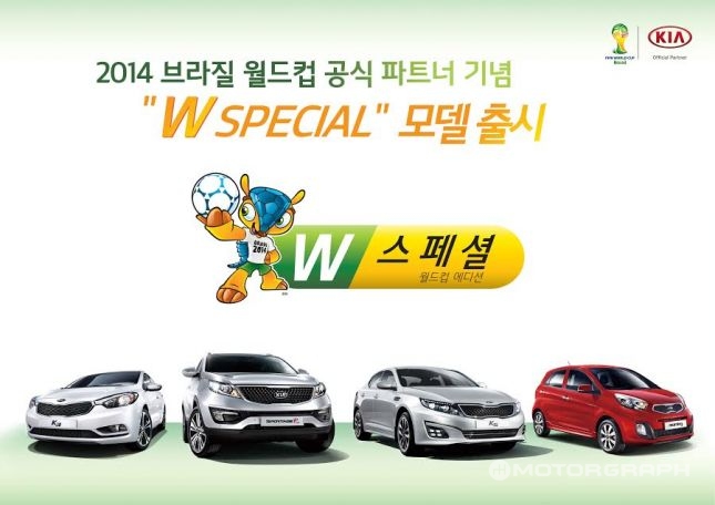 기아차는 12일 2014 브라질 월드컵을 앞두고 상품성을 강화한 모닝, K3, K5, 스포티지R의 'W 스페셜’ 모델을 출시한다고 밝혔다. W 스페셜은 7월 31일까지 판매되며 일반 모델과 디자인, 편의사양 등이 차별화됐다.