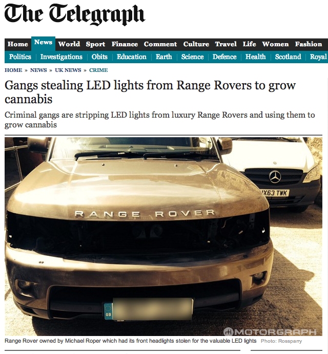 영국 경찰은 실내에서 대마초를 재배할 때 필요한 LED 조명을 구하기 위해 범죄조직이 랜드로버를 노리고 있다고 설명했다. 도둑들은 지렛대를 이용해 헤드램프와 라디에이터 그릴 등을 통째로 떼어낸 후 차량 도난 경보를 해제했다. 서툰 도둑들도 랜드로버의 LED 헤드램프를 훔치는데 60초가 채 걸리지 않는다고 경찰은 설명했다.
