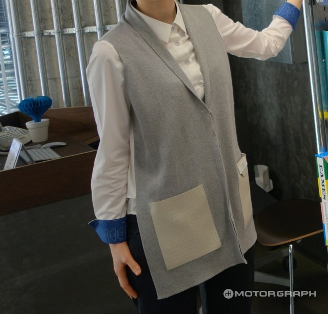 "제 옷도 특이 하지 않습니까? 이 부분은 차량 실내의 헤드라이닝이고 이 부분은 가죽시트를 잘라 만든 옷입니다"