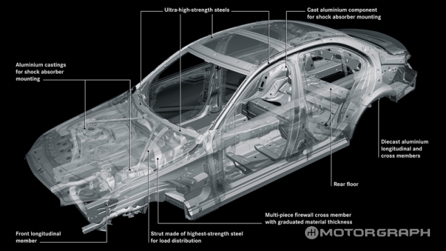 차체 크기는 4686×1810×1442(전장×전폭×전고mm)로, 이전 모델과 비교해 전장은 51mm, 전폭은 40mm 늘어났지만, 전고는 8mm 줄어 더욱 스포티해졌다. 특히, 차체의 50%가량을 알루미늄으로 만들어 이전 모델보다 100kg가량 가벼워졌다.