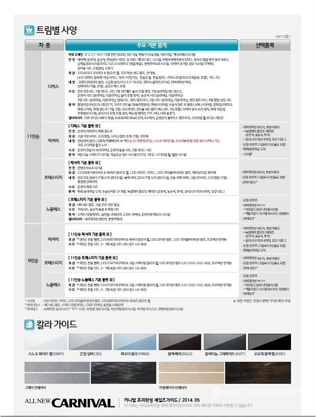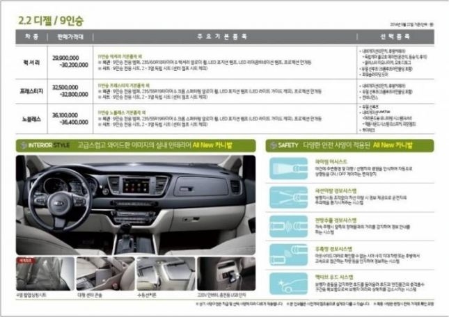 이 팸플릿에 따르면 ‘올 뉴 카니발’의 가격은 9인승의 경우 럭셔리 트림이 2990~3020만원, 프레스티지 트림이 3250~3280만원, 노블레스 트림이 3610~3640만원, 11인승의 경우 디럭스 트림이 2700~2730만원, 럭셔리 트림이 2940~2970만원, 프레스티지 트림이 3200~3230만원, 노블레스 트림이 3560~3590만원의 범위 내에서 책정될 예정이다. (자동변속기 기준) 여기에 각종 선택사양을 더하면 가격은 최대 4000만원을 넘을 것으로 보인다.