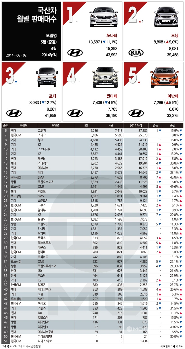2위는 기아차 모닝이 차지했다. 모닝은 지난달 8808대가 판매됐으며 4월에 비해 판매가 소폭 상승했다. 올해 누적판매는 3만9458대로 매달 8천대 가량 꾸준하게 판매되고 있다.
